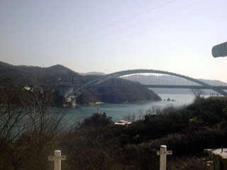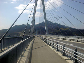 再び走り出す。愛媛県へ入ったことで、サイクリングロードの標識のフォーマットも変わる。管理事務所が違うのだろう。大三島の東岸に沿って南下する。しかしこの大三島最後の2kmがすごかった。道は細くミカン山の中を登る坂道。中山峠を思い出す。しかも工事中だとかで砂利道。つくば〜博多と尾道からここまで走ったけど未舗装のところを走ったのは初めて。山を下ったところで本州四国連絡橋のうちもっとも古い大三島橋。吊り橋や斜張橋が多い本州四国連絡橋において唯一のアーチ橋である。開通は昭和54年ですでに私の記憶に無い。実際橋も古さを感じる。50円なり。