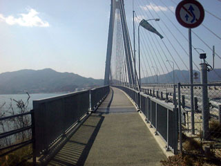 パンフレットなどには、「尾道大橋は歩道が狭く危険ですので、向島へは渡船をご利用ください。」とあり、ほとんどのサイクリング用のパンフレットが向島からの案内になっている。それでは本州と四国が地続きになった意味が無いではないか。危険かどうかはオレが判断するとばかりに渡ってみるとなんのことはない。普通の橋である。天竜川や岡山バイパスの方がよっぽど危険である。気にかける必要なし。