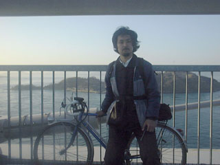 下りに入り、夕日とともに目の前に四国、そして最後の来島海峡大橋が見えてきた。ついに自分の足で、本州から四国まで来たのである。