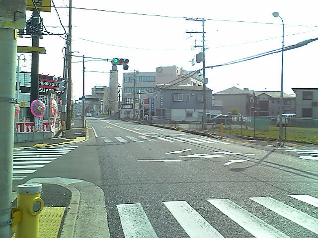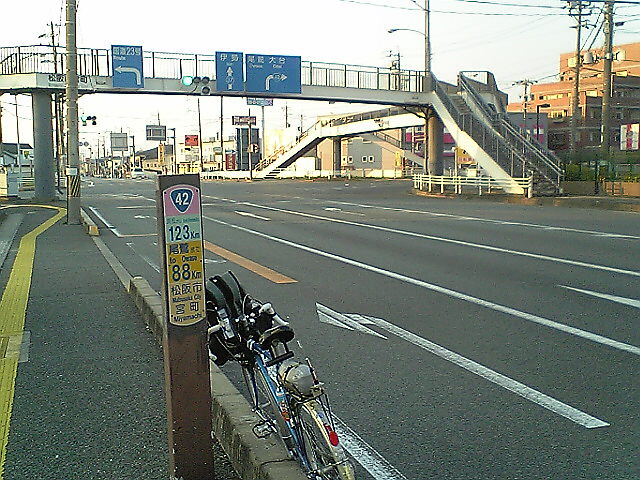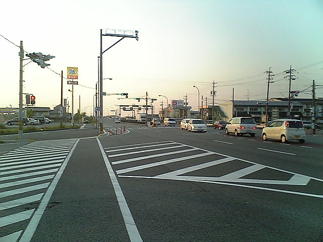 (H22/05/01 19:08:05) 国道42号は23号と共用のまま松阪市街地を北に抜け、23号と別れるここ小津町交差点で鋭角に曲がり、再び松阪市街地へ向かうという不思議なルートになっています。 そこで、楽にかつ正確に42号をトレースするため、松阪市街地に宿を取り、チェックインして荷物を置いて身軽になってから、この部分を走ります。 (