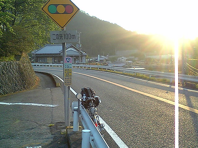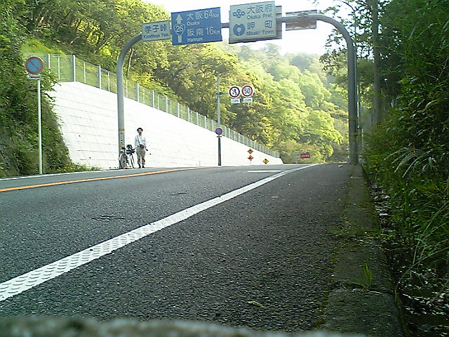 (H22/05/05 07:07:24) 最後の県境です。 一番身近な県境だったのに、意外にも三十三になるまで通ったことはありませんでした。 逆車線を使って命懸けのセルフタイマーです。 (