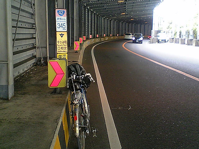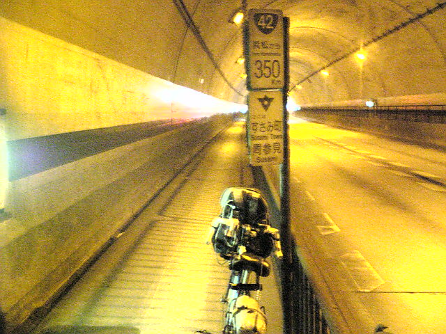 (H22/05/03 15:06:08) 浜松から350km地点です。 朝来トンネル内です。 またまたトンネルですが、歩道に退避してある意味まったり休憩しています。 涼しいし。(笑) (