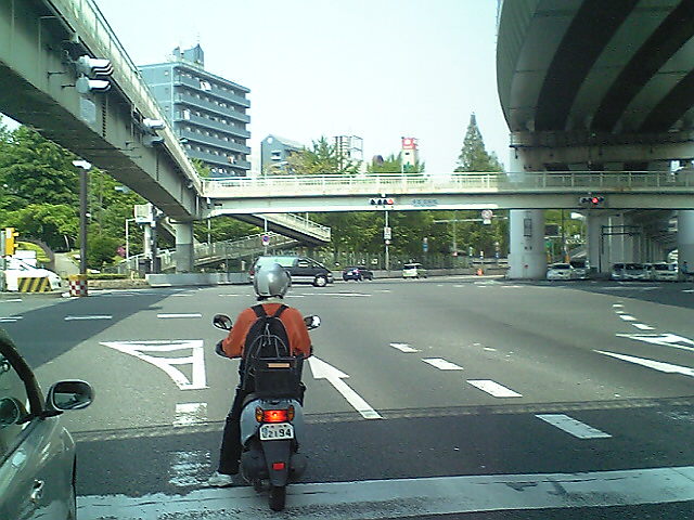 (H22/05/05 13:38:50 大阪府堺市) 梅田新道まであと15kmです。 ここで最後の寄り道です。 前は脇道からよく確認せずに飛び出して来たクソ原付。 衝突しそうになったのを必死でかわしました。 ついでに35km/hの自転車引き離して行ったのでスピード違反ですよ! せっかく写真に入ったので晒し上げ。(笑) (