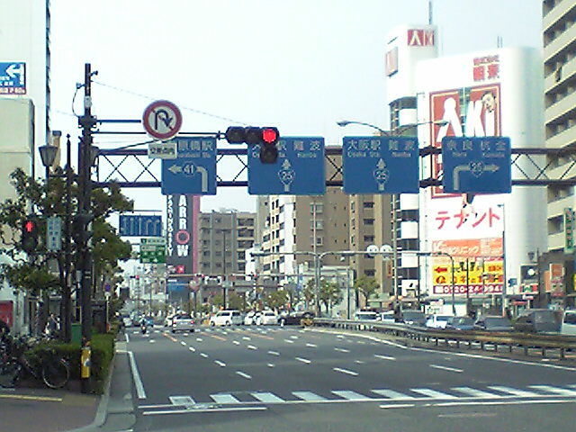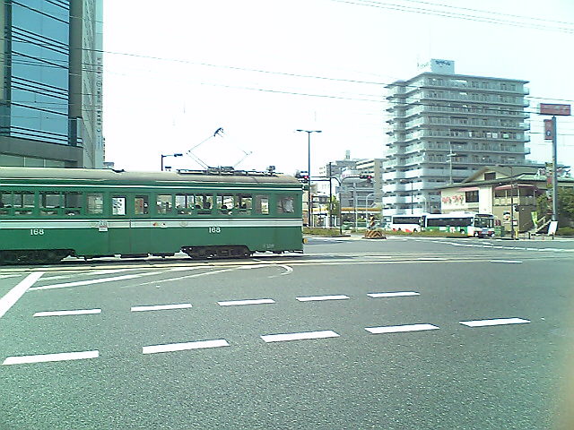 (H22/05/05 14:05:44) 宿院交差点で電車と交差。 最近、堺市内から天王寺駅前まで直通するようになりました。 (逆に恵美須町直通がほとんど無くなったので、でんでんタウンを利用していた私には不便かも。) (