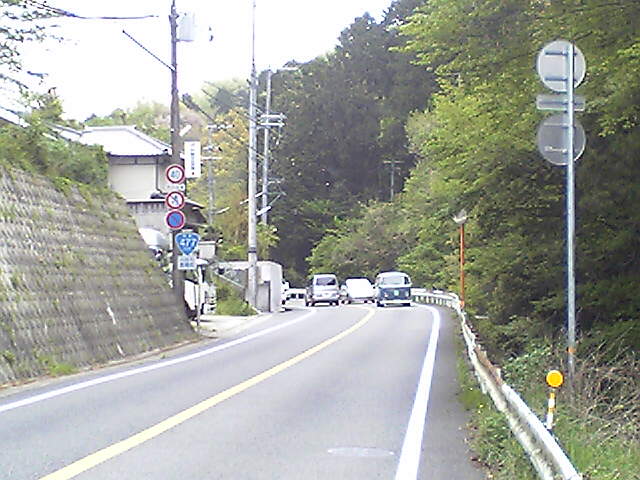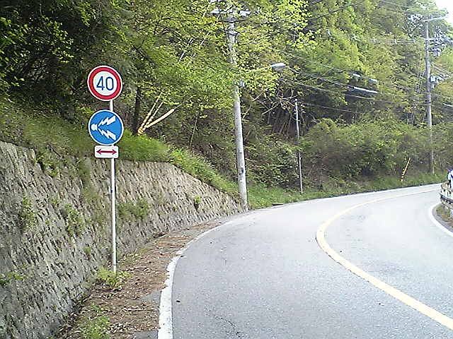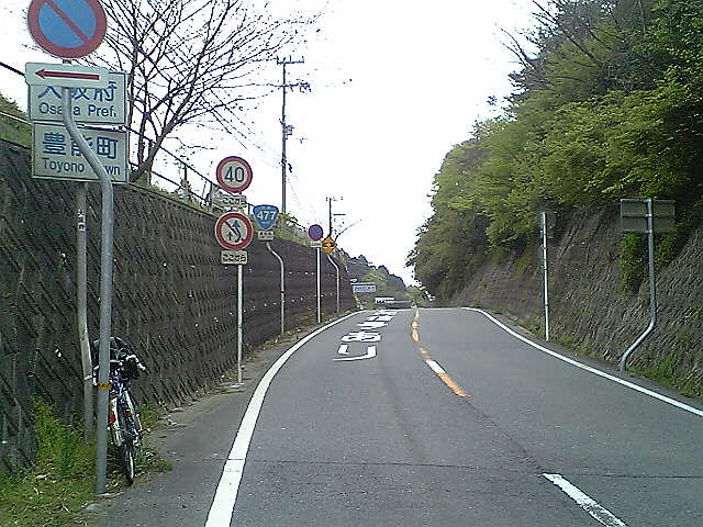 (H24/04/30 10:11:16 大阪府能勢町) 新しく出来た高架橋を40km/hオーバーで爆走。そこの車!自転車を抜いてはいけません。(制限速度40km/h) 野間稲地で府道4号線と交差。 地図で見てみると「腐道」の臭いがします(笑)。 (