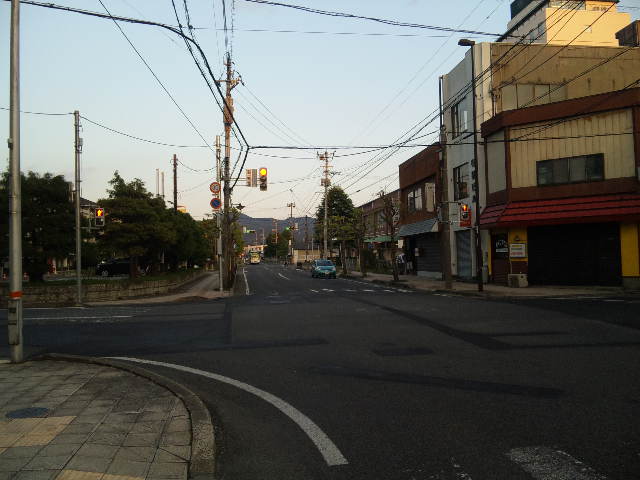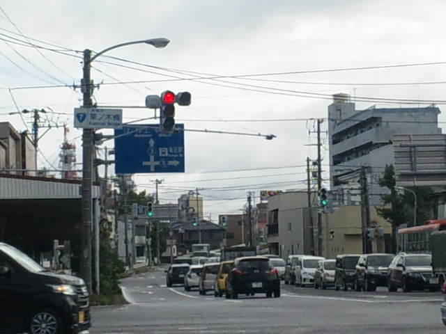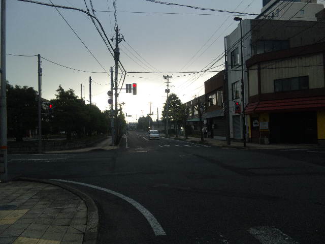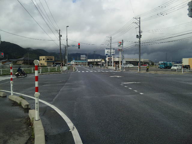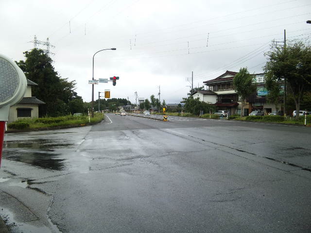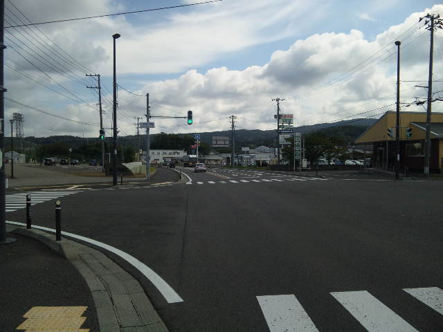 (H27/09/22 17:15:33 秋田県大館市)  大館到着。 大館市街地はバイパス化されていないため、道が狭い上にアップダウンが激しいです。 国道7号はここ、大館市役所前で左折します。普通の街中の交差点ですが…。 本日はここまでです。 (写真