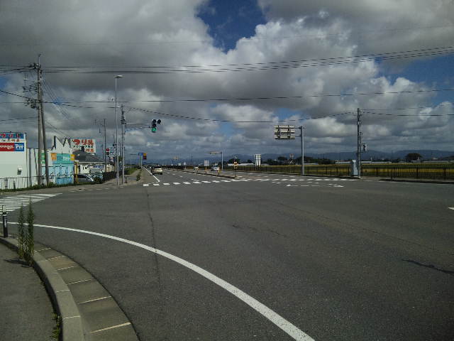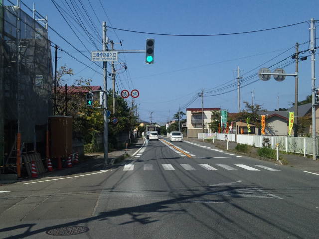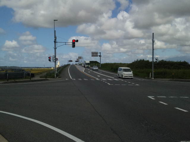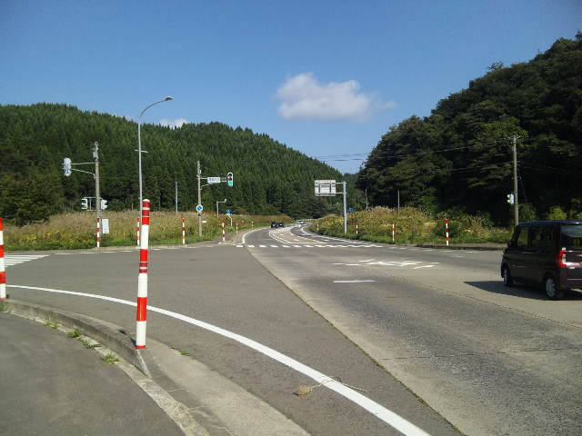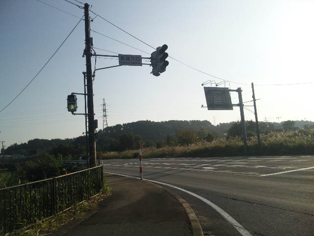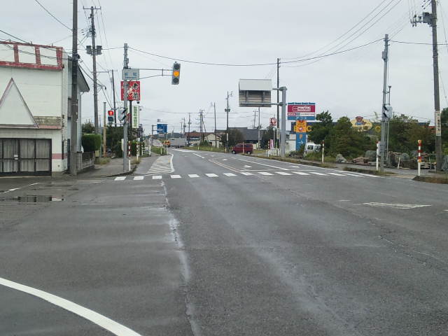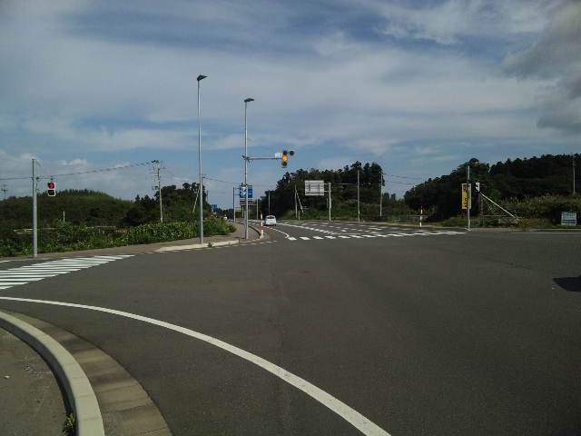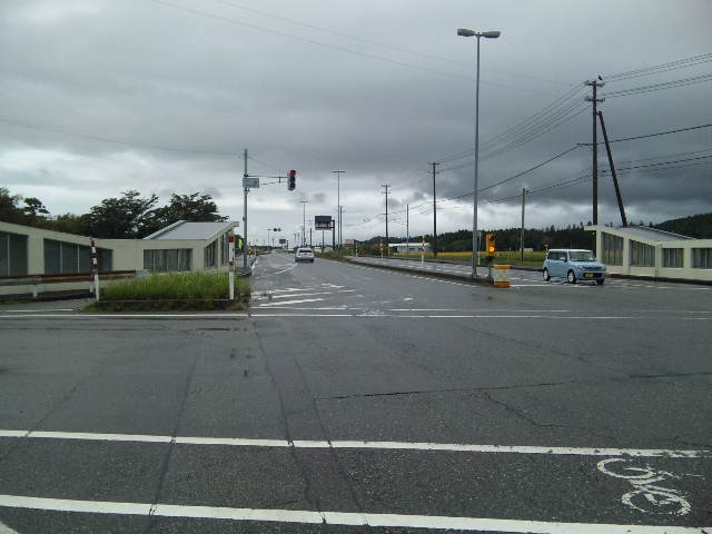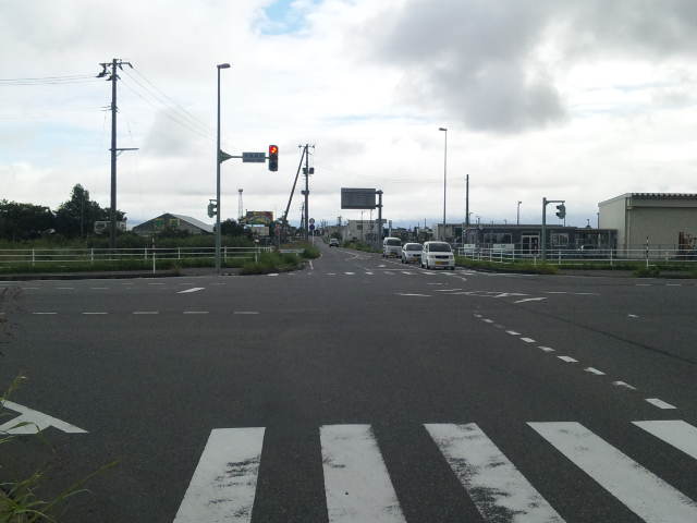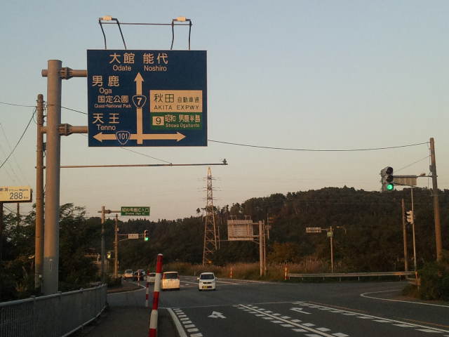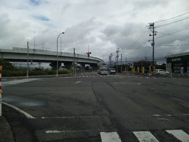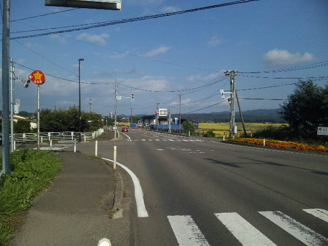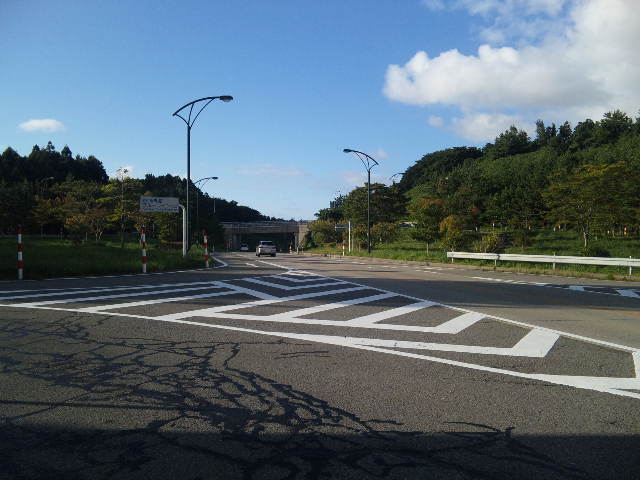 (H27/09/22 07:16:34 秋田県潟上市昭和)  昨日の地点に戻りました。 大館に向けて出発です。 ちなみにこの交差点の名称、単に「高速入口」。 「○○IC」という交差点は多々ありますが、「高速入口」は全国唯一です。 (写真