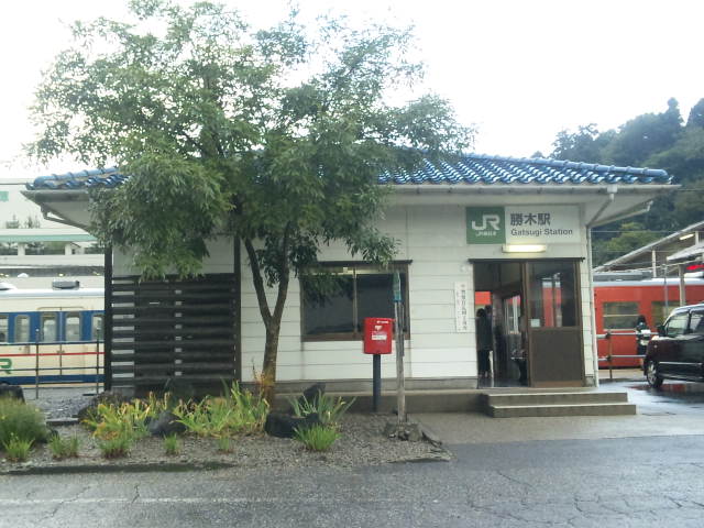 (H27/09/19 17:14:09 新潟県村上市(山北))  勝木駅前。 本日はここまでです。 僅かに100キロポストまで至らず。 ここでまた激しい雨が降って運転見合わせ。 宿まであと少しなのに…。 (写真