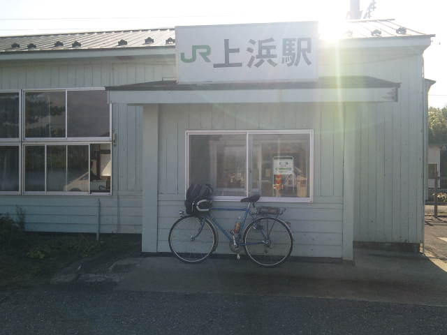 (H27/09/21 08:15:26)  上浜駅。 近々無人化されるとのことで、記念に切符購入とスタンプ押印。 (写真