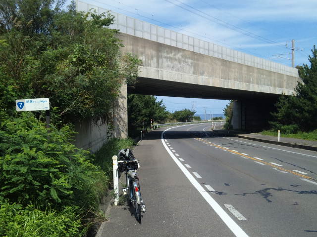 (H27/09/21 10:28:24)  新潟市から222km地点。 羽越本線のガード下、向こうは日本海です。 (写真
