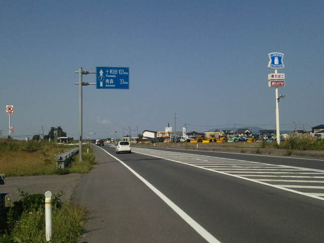 (H27/09/23 12:58:37)  7号も終わりが近づいてきました。 青看にも7号以外の地名(4号十和田市)が出てきました。 (写真