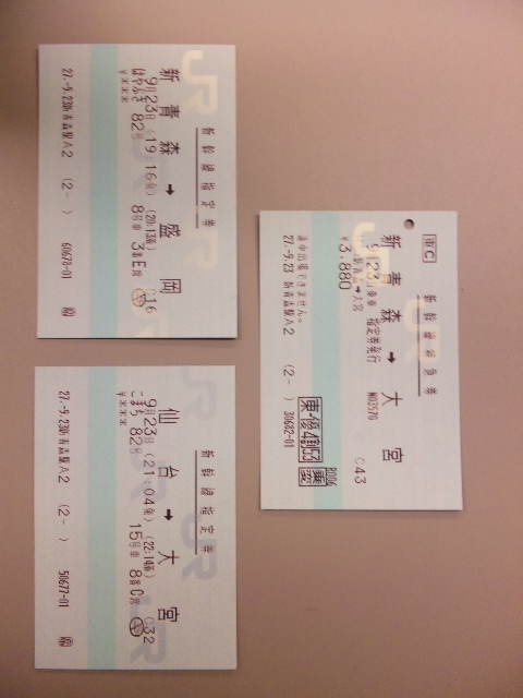 (H27/09/23 19:50:46)  乗ってから切符を見てびっくり。 新青森→大宮の席無し特急券と「はやぶさ82号」新青森→盛岡の指のみ券、「こまち82号」仙台→大宮の指のみ券。 「はやぶさ」も「こまち」も全車指定席。盛岡→仙台はどうしろと? (写真