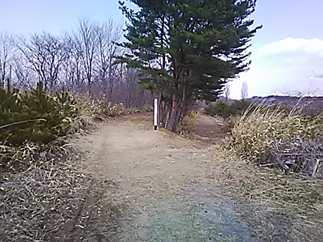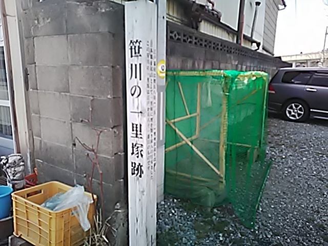 (R07/10/12 13:51:39) ガムテープに巻かれた一里塚への案内柱。 行ってみましたが、吠える犬がいて河原にはたどり着けず。 (