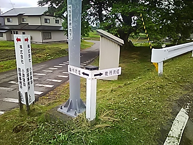 (R07/06/01 12:49:40 日詰郡山(陸中)) 久しぶりに大きくカーブ。 奥州街道を示す道しるべもあります。 (