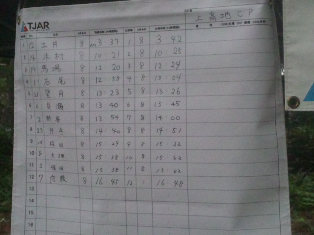 (22/08/08 19:43:35) レースの方は2日目が終わろうとしています。 上高地CPには坪井さん、駿谷さん、牧野さんが到着するようです。 (私は撤収済) 上高地の天気は雨、雷注意報が出ています。